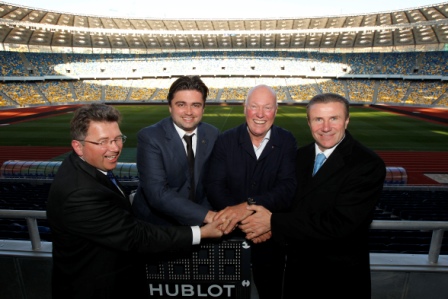 As Official Watch of the UEFA EURO 2012 ™, and also present on the referee board of the 14th UEFA European Football Championship, Hublot has chosen the Kyiv Olympic Stadium, an imposing 68,000-seater structure and the venue which will host several UEFA EURO 2012™ matches as well as the final scheduled for 1st July 2012, as the symbolic location for the unveiling of its two official UEFA EURO 2012™ watches.